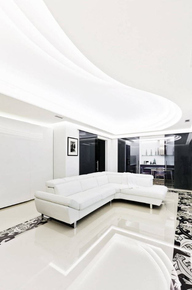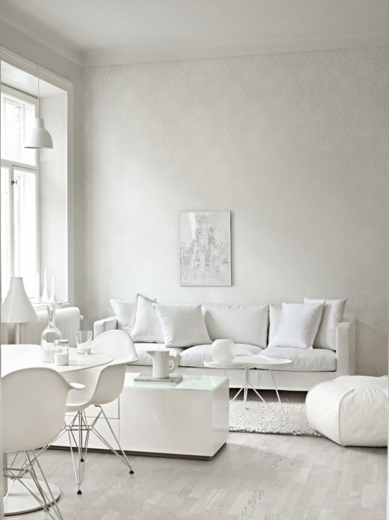 Благодаря образованию бликов на этих предметах, обычный белый цвет заиграет новыми оттенками, которые устранят монотонность и однообразие белого цвета в интерьере, создается ощущение чистоты. Правильное освещение является одной из важных составляющих белого интерьера.
