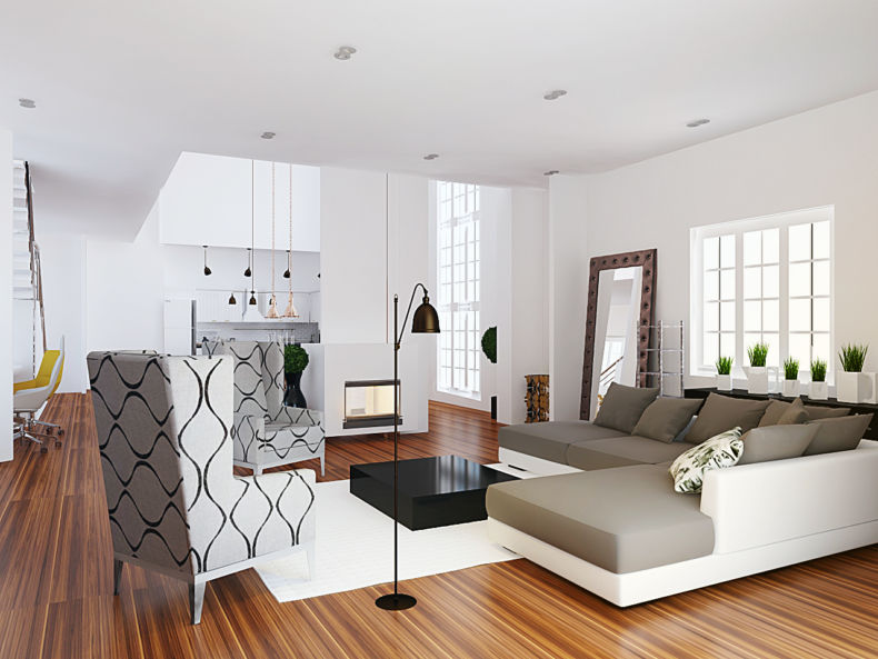 Похожие по своей идее стили имеют в основе строгие геометрические формы, отсутствие большого числа аксессуаров и много свободного пространства. Белый цвет для пола хорошо справляется с поставленной задачей, добавляя интерьеру свежесть и «раздвигая» стены.