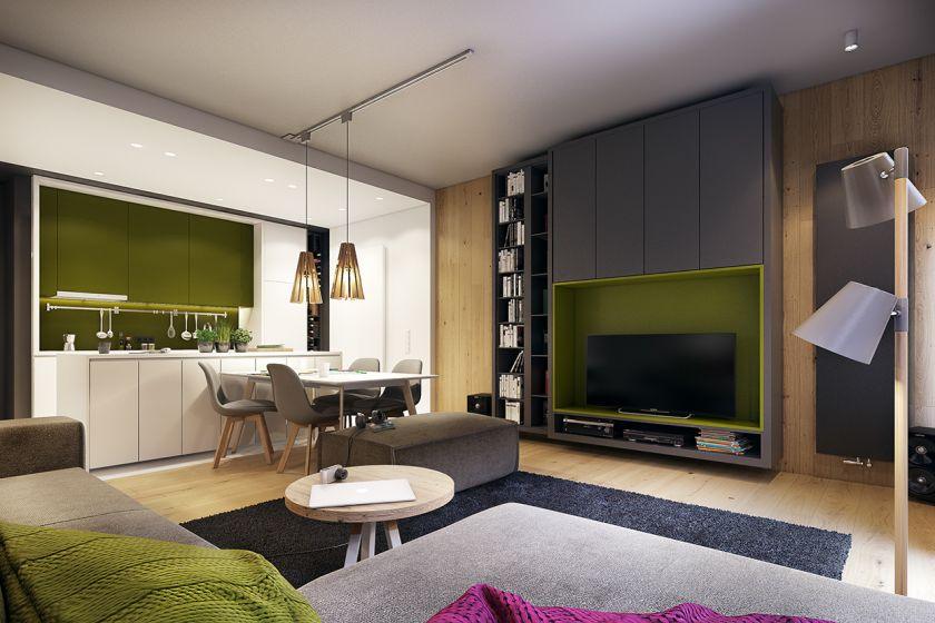 Если грамотно подобрать дизайн, то все это легко уместить даже на маленькой площади. Дизайнеры советуют владельцам такой квартиры применять в гостиной только светлые цвета, которые должны обязательно сочетаться друг с другом.